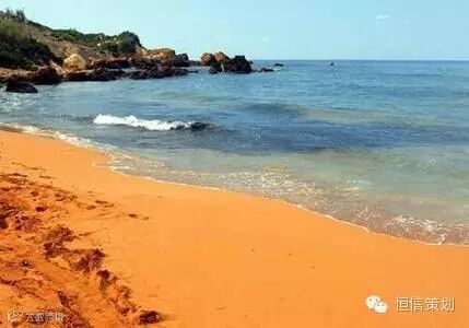 這很罕見,但確實存在。橙色是由於沙子裡含鐵量高,但卻又沒有火山岩中顏色較暗的沙子來中和。這類沙灘最有名的位於馬爾他群島的拉姆拉灣。