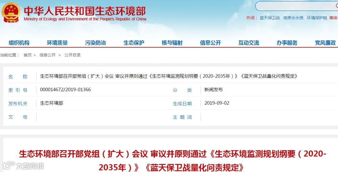 生态环境部召开部党组(扩大)会议 审议并原则通过《生态环境监测规划纲要(2020-2035年)》《蓝天保卫战量化问责规定》