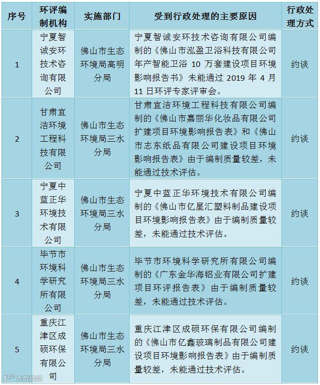 为提高环评文件编制质量,保证环评审批实效,佛山市各级生态环境主管部门进一步加大对环评编制机构和环评工程师的监督检查和责任追究力度。2019年第二季度共对存在问题的5家环评编制机构予以行政处理5家次,现将有关情况予以通报。
