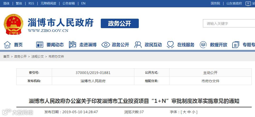 淄博市人民政府办公室关于印发淄博市工业投资项目“1+N”审批制度改革实施意见的通知