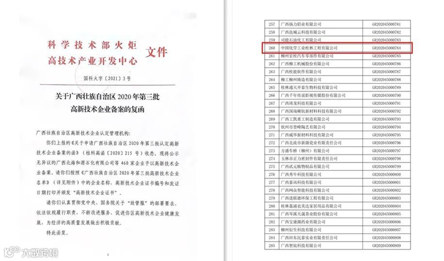 近日,全国高新技术企业认定管理工作领导小组办公室发布《关于广西壮族自治区2020年第三批高新技术企业备案的复函》,中国化学