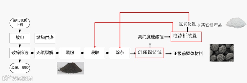 项目创新性地将湿法冶金和电化学反应相结合,开发出了“全封闭式锂离子电池活性材料再生系统”,该系统能使系统内的所有物料封闭式循环,包括硫酸根、铵根等被其它技术放弃的物质,从真正意义上做到了封闭循环。该系统做到了闭环,并非经过废水废气无害化处理,使废弃物达到排放标准,而被称为所谓的“全封闭回收工艺”,真正循环利用了系统内的物料(除了黑粉中的碳渣)。