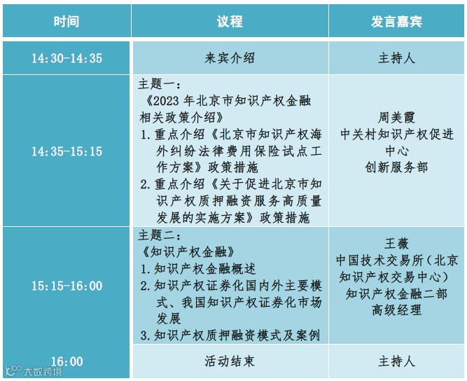 为贯彻落实中共中央办公厅、国务院办公厅印发《建设高标准市场体系行动方案》的精神,中国技术交易所将着力建设国家知识产权和科技成果产权交易机构,在全国范围内开展知识产权转让、许可等运营服务,加快推进技术交易服务发展。为进一步提升企事业单位、高校科研院所和社会组织的知识产权保护意识及工作水平,推动知识产权工作迈上新台阶,由北京市科学技术委员会、中关村科技园区管理委员会、北京市知识产权局指导,中国技术交易所(北京知识产权交易中心)、中国技术交易所有限公司知识产权纠纷人民调解委员会、中关村商标服务中心主办的2023年“知识产权巡讲季” 第四期培训定于6月16日(周五)下午14点30分举行。活动采取线下培训与线上同步直播模式。