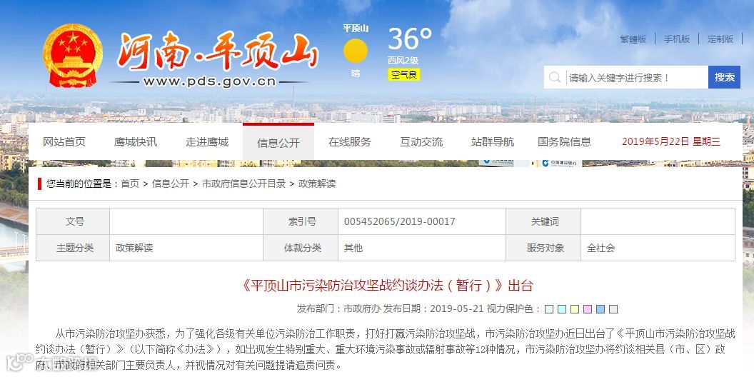 《平顶山市污染防治攻坚战约谈办法(暂行)》出台