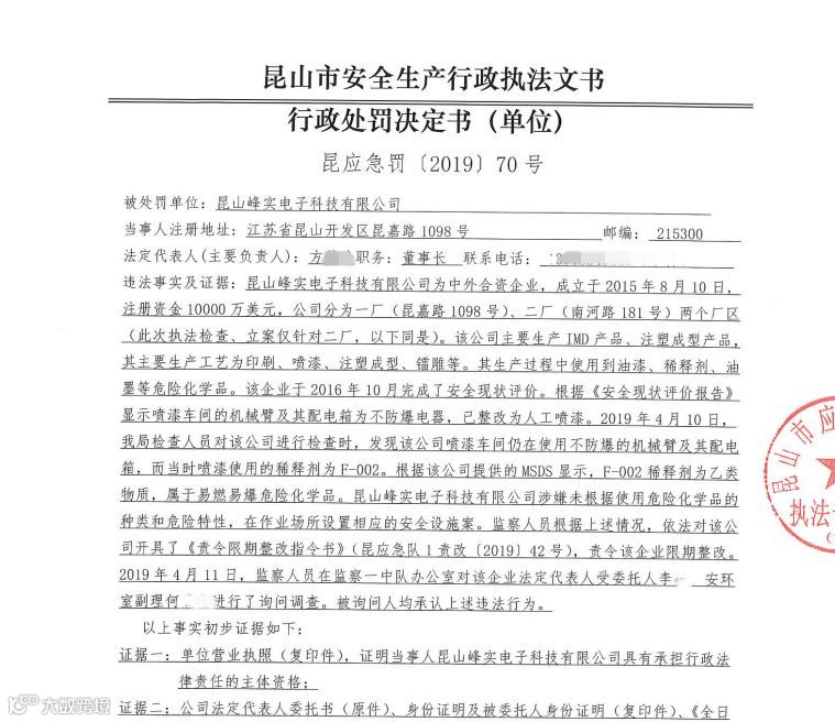 4月10日,市应急管理局执法队员对位于开发区的昆山峰实电子科技有限公司二厂进行执法检查时发现,该公司喷漆车间喷漆使用的稀释剂F-002为乙类物质,属于易燃易爆危险化学品,而该车间仍在使用不防爆的机械臂及其配电箱。昆山峰实电子科技有限公司涉嫌未根据使用危险化学品的种类和危险特性,在作业场所设置相应的安全设施案。执法队员根据上述情况,依法对该公司开具了《责令限期整改指令书》,责令该企业限期整改,并对其进行立案调查。