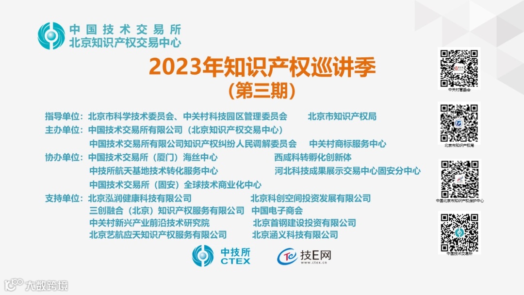 为贯彻落实中共中央办公厅、国务院办公厅印发《建设高标准市场体系行动方案》的精神,中国技术交易所将着力建设国家知识产权和科技成果产权交易机构,在全国范围内开展知识产权转让、许可等运营服务,加快推进技术交易服务发展。为进一步提升企事业单位、高校科研院所和社会组织的知识产权保护意识及工作水平,推动知识产权工作迈上新台阶,由北京市科学技术委员会、中关村科技园区管理委员会、北京市知识产权局指导,中国技术交易所(北京知识产权交易中心)、中国技术交易所有限公司知识产权纠纷人民调解委员会、中关村商标服务中心主办的2023年“知识产权巡讲季” 第三期培训定于6月9日(周五)下午14点30分举行。活动采取线下培训与线上同步直播模式。