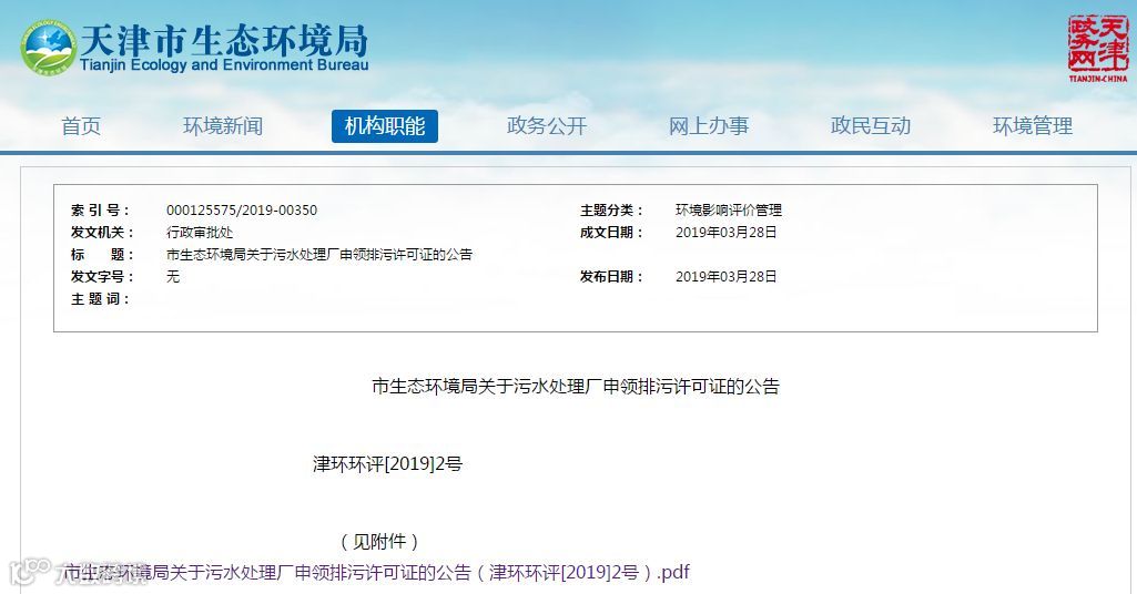 市生态环境局关于污水处理厂申领排污许可证的公告(津环环评[2019]2号).pdf