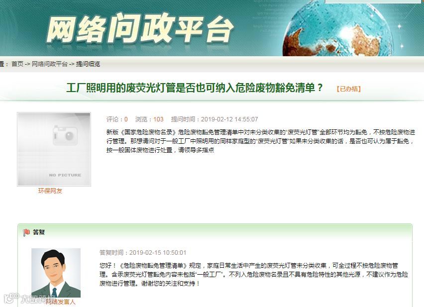 新版《国家危险废物名录》危险废物豁免管理清单中对未分类收集的“废荧光灯管”全部环节均为豁免,不按危险废物进行管理。那想请问对于一般工厂中照明用的同样家庭型的“废荧光灯管”如果未分类收集的话,是否也可认为属于豁免,按一般固体废物进行处置,请领导多指点