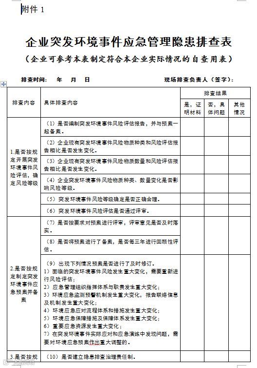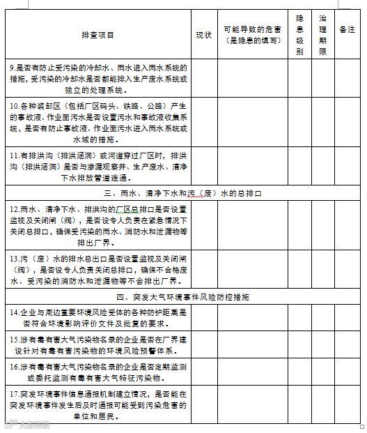 (二)自查整改阶段(4月中旬至5月中旬)。各级生态环境部门督促辖区环境风险源企业进行自查自纠。有关企业开展全面的环境风险隐患排查,并将检查内容纳入安全生产检查自查自纠工作中,对发现的一般环境风险隐患迅速进行整改;对重大环境风险隐患立即制定整改方案,经专家论证后实施。5月10日前,有关企业向县(市、区)生态环境部门报送环境风险隐患排查及整改情况报告。