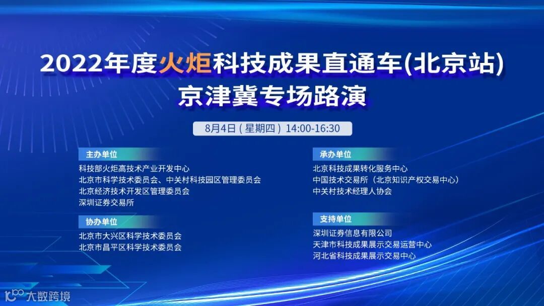 为全面贯彻党的十九大和十九届历次全会精神,认真落实中共中央办公厅、国务院办公厅《建设高标准市场体系行动方案》《要素市场化配置综合改革试点总体方案》及中央经济工作会议要求,提升技术要素市场化配置能力,促进北京地区高水平科技成果与科技企业、投资机构高效对接,服务京津冀产业协同和经济高质量发展,举办2022年度“火炬科技成果直通车”(北京站)京津冀专场路演活动。