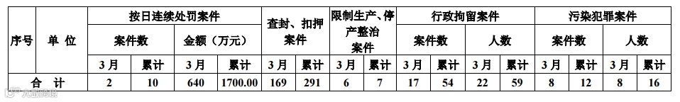 2019年1-3月,全省生态环境系统行政处罚共立案1859起,已下达处罚决定1823起,罚款金额9950.48万元,分别是去年同期的130.27%、133.07%和153.61%。按照《环境保护法》四个配套办法、《治安管理处罚法》等查办的环境违法案件总数为374起,其中,按日连续处罚10起,查封扣押291起,限产停产7起,行政拘留54起(59人)、涉嫌环境污染犯罪12起(16人)。