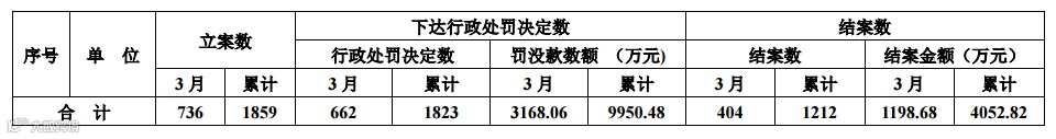 2019年3月,全省生态环境系统行政处罚案件共立案736起,已下达行政处罚决定662起,罚款金额3168.06万元。在查办的环境违法案件中,按《环境保护法》四个配套办法、《治安管理处罚法》等查办的案件总数为202起,其中,按日连续处罚2起,查封扣押169起,限产停产6起,行政拘留17起(22人),涉嫌环境污染犯罪8起(8人)。