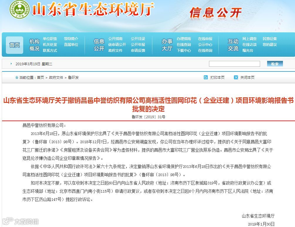 山东省生态环境厅关于撤销昌邑中誉纺织有限公司高档活性圆网印花(企业迁建)项目环境影响报告书批复的决定