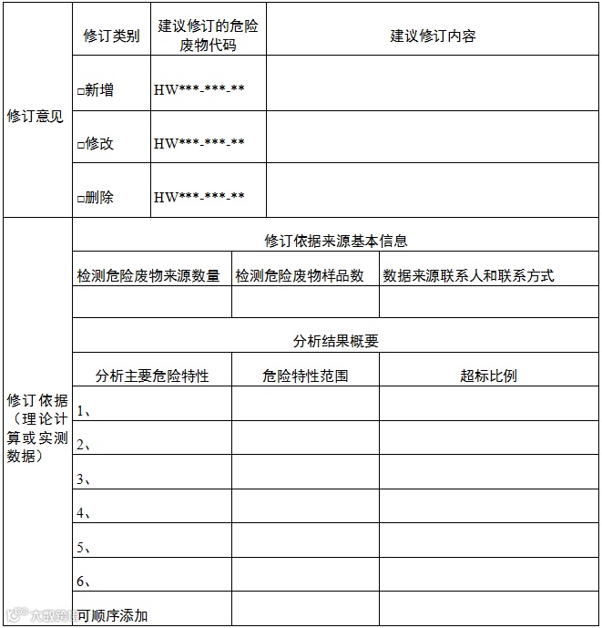 《国家危险废物名录》修改意见征求表