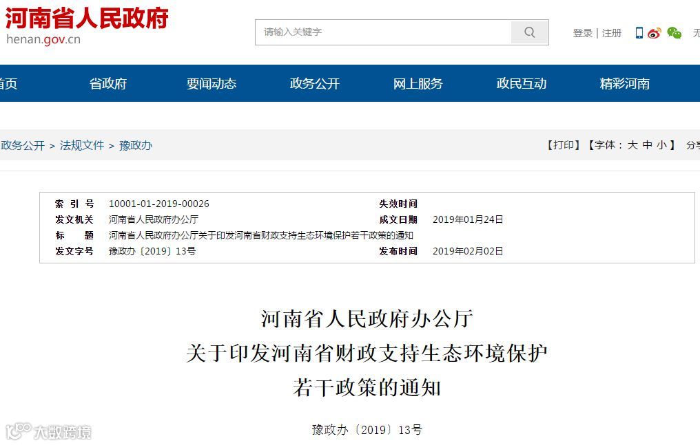 河南省人民政府办公厅关于印发河南省财政支持生态环境保护若干政策的通知