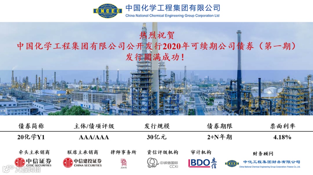 12月21日,中国化学工程集团成功发行2020年第一期可续期公司债券,发行规模30亿元,创2020年以来建筑行业2+N年期可续期公司债券单期最大发行规模;发行利率4.18%,创近期同级别企业类似项目的最低发行利率,本次发行取得圆满成功。