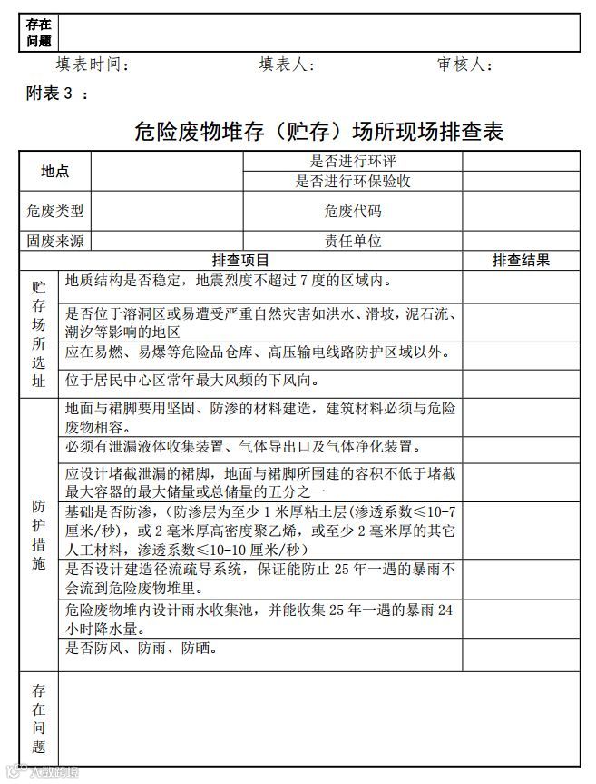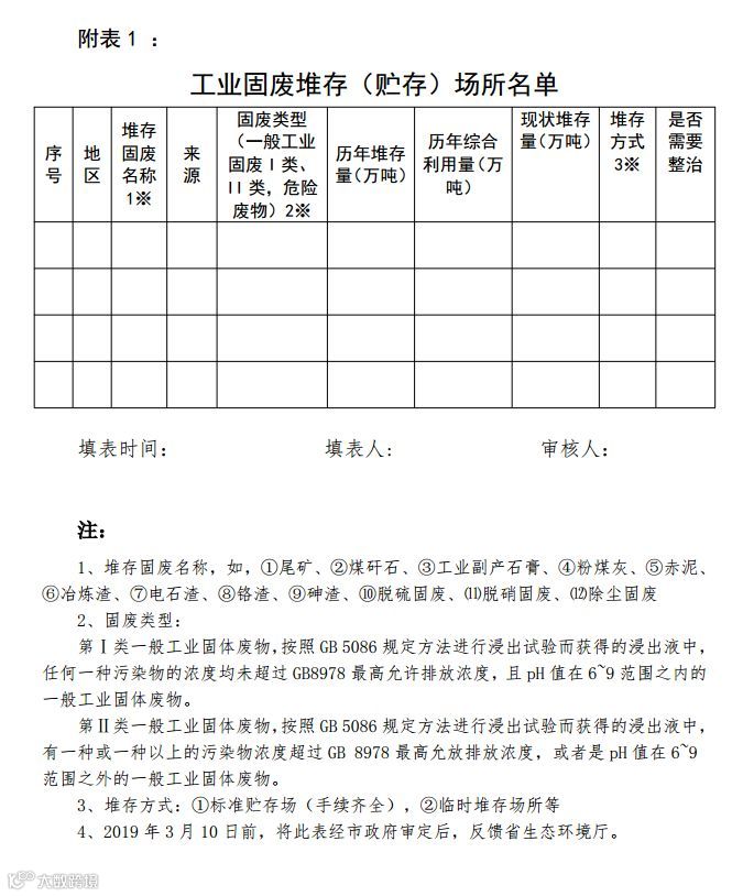 (一)全面排查阶段(2019 年 2 月底前)。各市根据生态环境、发展改革、工业和信息化等部门提供的相关材料,详细核查本辖区工业固体废物的贮存场所和堆存场所,以县(市、区)为单位,列出辖区贮存场所和堆存场所名单(附表 1);对照相关标准进行现场排查(附表 2、附表 3),筛选“三防”措施不到位,以及存在土壤和地下水污染隐患的问题堆场名单(附表 4)。2019年 3 月 10 日前,将附表 1 和附表 4 汇总情况,经市政府审定后,反馈省生态环境厅。