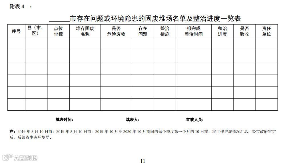 (二)制定整治方案阶段(2019 年 4 月底前)。对排查发现存在问题和隐患的堆存场所,按照谁产生、谁治理的原则,由责任主体单位制定环境整治方案,完善“防扬散、防流失、防渗漏”措施,并报所在地生态环境部门备案。无法找到责任单位的,由当地人民政府负责治理。根据整治方案完善附表 4 相关内容,2019年 5 月 10 日前,经市政府审定后,反馈省生态环境厅。