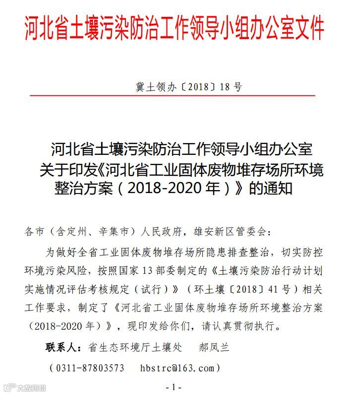 河北省土壤污染防治工作领导小组办公室关于印发《河北省工业固体废物堆存场所环境整治方案(2018-2020 年)》的通知
