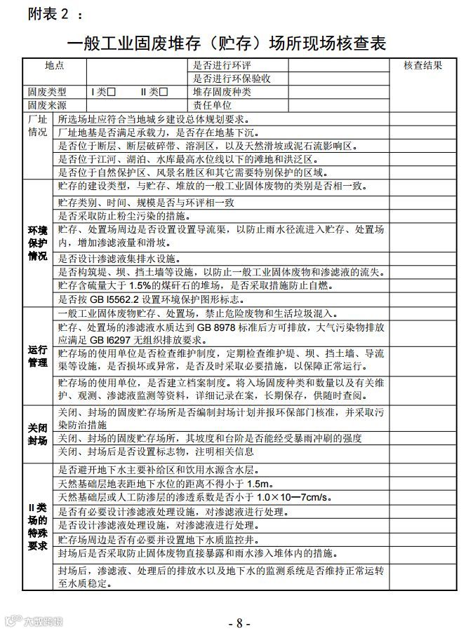 (一)全面排查工业固体废物堆放场所环境隐患。摸清我省工业固体废物(尾矿、煤矸石、工业副产石膏、粉煤灰、赤泥、冶炼渣、电石渣、铬渣、砷渣,以及脱硫、脱硝、除尘产生的固体废物)堆存(贮存)场所底数(以下简称“堆存场所”),核查堆存场所“防扬散、防流失、防渗漏”设施情况,按照《一般工业固体废物贮存、处置场污染控制标准》(GB18599-2001)和《危险废物贮存污染控制标准》(GB18597-2001)相关要求,列出问题场所清单。