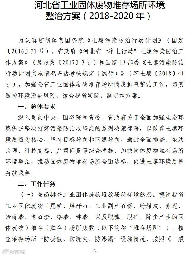 河北省工业固体废物堆存场所环境整治方案(2018-2020 年)