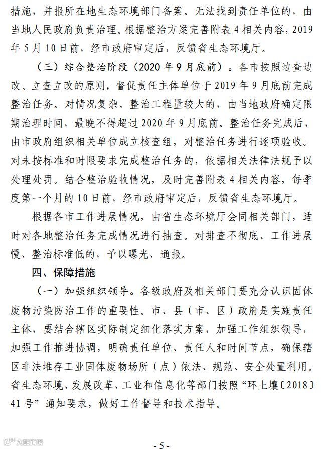 (一)加强组织领导。各级政府及相关部门要充分认识固体废物污染防治工作的重要性。市、县(市、区)政府是实施责任主体,要结合辖区实际制定细化落实方案,加强工作组织领导,加强工作推进协调,明确责任单位、责任人和时间节点,确保辖区非法堆存工业固体废物场所(点)依法、规范、安全处置利用。省生态环境、发展改革、工业和信息化等部门按照“环土壤〔2018〕41 号”通知要求,做好工作督导和技术指导。