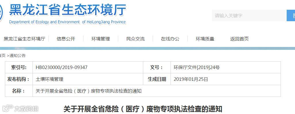 近期,中央媒体集中报道了不法企业利用土地复垦项目非法填埋危险废物的环境违法案件,为严格落实《环境保护法》《固体废物污染环境防治法》《土壤污染防治行动计划》及《黑龙江省黑土地污染防治专项行动方案》等要求,严厉打击危险废物污染环境违法行为,我厅决定开展全省危险(医疗)废物专项执法检查。现将有关事宜通知如下。