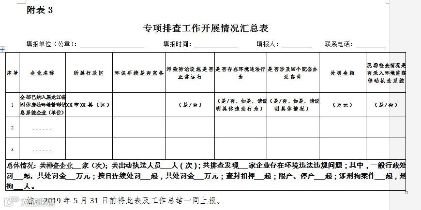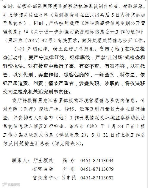 我厅将根据黑龙江省固体废物环境管理信息系统内信息,针对危险(医疗)废物产生、转移、贮存及利用量较大企业进行抽查,并安排专人对各市(地)工作开展情况及环境监察移动执法系统信息录入情况进行检查。请各市(地)于1月24日前上报工作方案及联系人信息(详见附表2);5月31日前上报工作总结及问题排查汇总表(详见附表3)。
