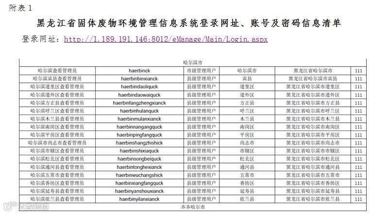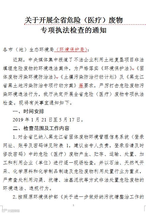 1.对全省已纳入黑龙江省固体废物环境管理信息系统(登录网址、账号及密码详见附表1,建议由专人负责,登录后请及时修改密码)中的危险(医疗)废物产生、贮存、运输、处置、加工和利用企业(单位)进行逐一现场检查,并以石油、天然气开采、化学原料和化学制品制造及危险废物利用处置行业为重点,严肃查处利用沟渠、坑塘、油基泥坑等方式非法处置危险废物的环境违法、违规行为。