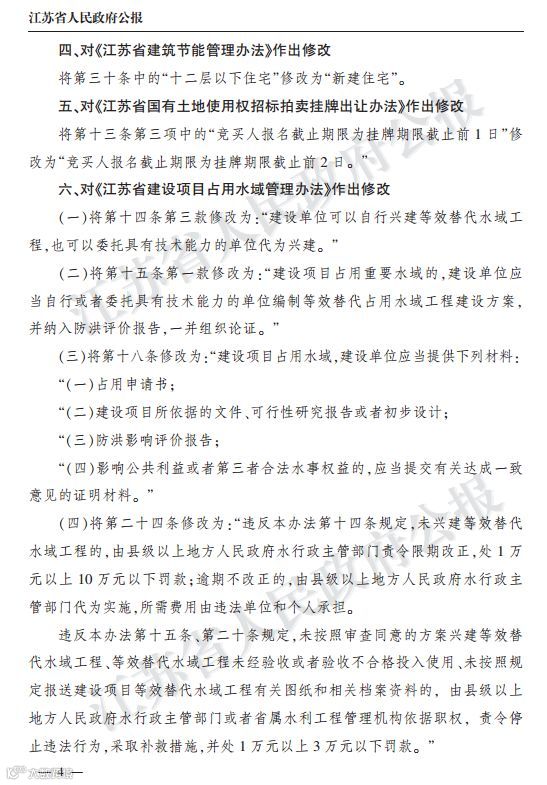 六、对《江苏省建设项目占用水域管理办法》作出修改