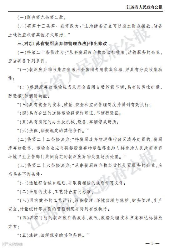 三、对《江苏省餐厨废弃物管理办法》作出修改
