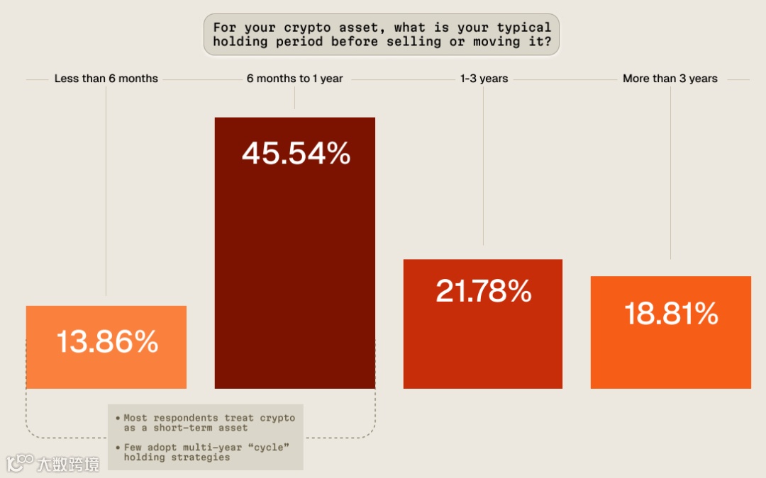 调研显示,散户在投资决策上普遍保守且短期导向:超60%持有加密资产不足一年,且年化收益率需达到6%以上才具备吸引力,个位数APY难以打动用户。
