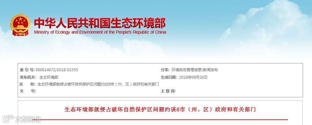 9月26日,生态环境部就侵占破坏自然保护区问题约谈辽宁锦州市长于学利,吉林延边朝鲜族自治州州长金寿浩,江苏镇江市长张叶飞,安徽宣城市长张冬云,重庆沙坪坝区区委书记江涛、北碚区区长何庆,云南丽江市长郑艺和西双版纳傣族自治州州长罗红江,以及安徽省林业厅厅长牛向阳、重庆市林业局局长沈晓钟、云南省林业厅厅长任治忠。要求严格自然保护区管理,推进中央环保督察和“绿盾2017”整改落实,禁止以损害自然保护区为代价谋求一时一地经济增长。