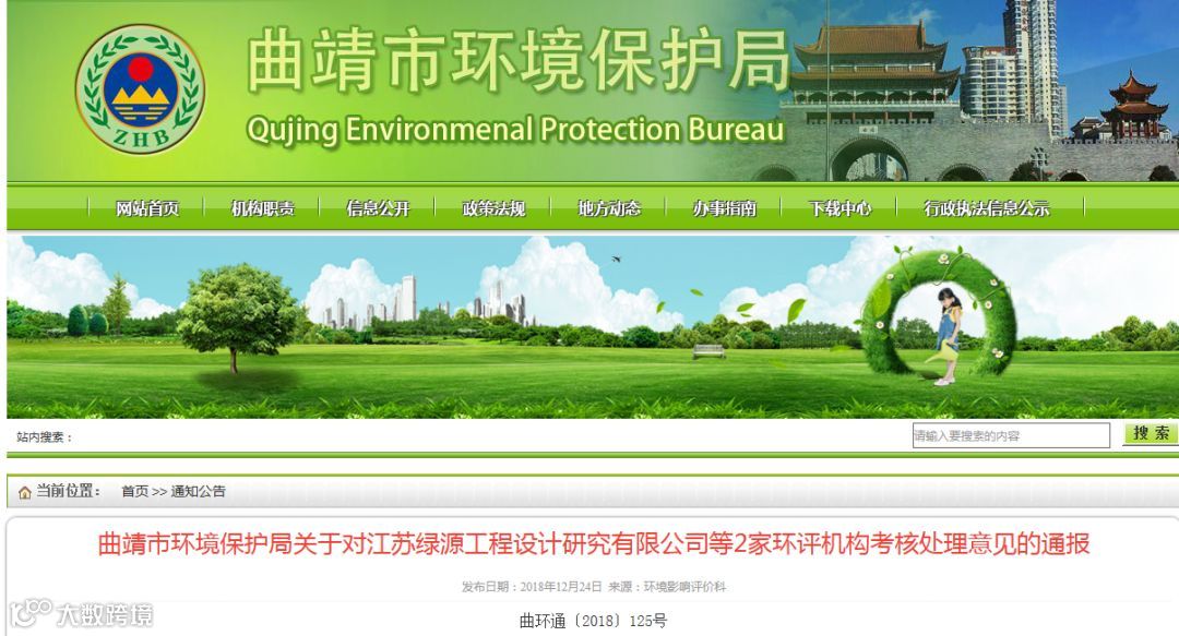 曲靖市环境保护局关于对江苏绿源工程设计研究有限公司等2家环评机构考核处理意见的通报