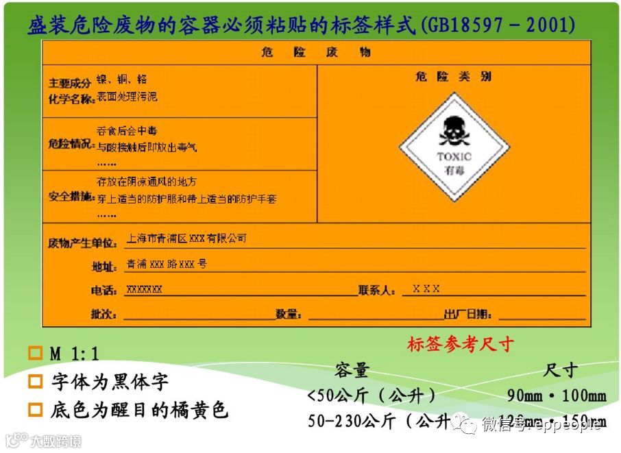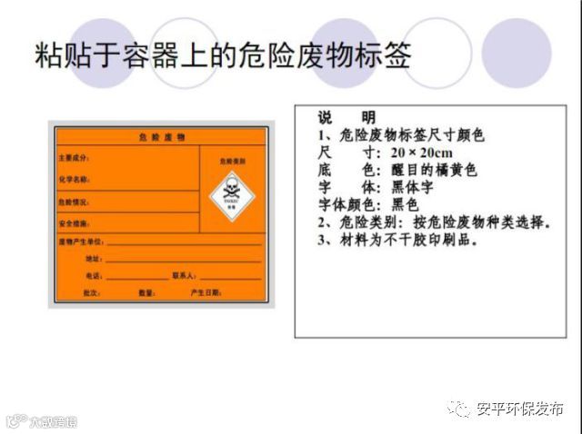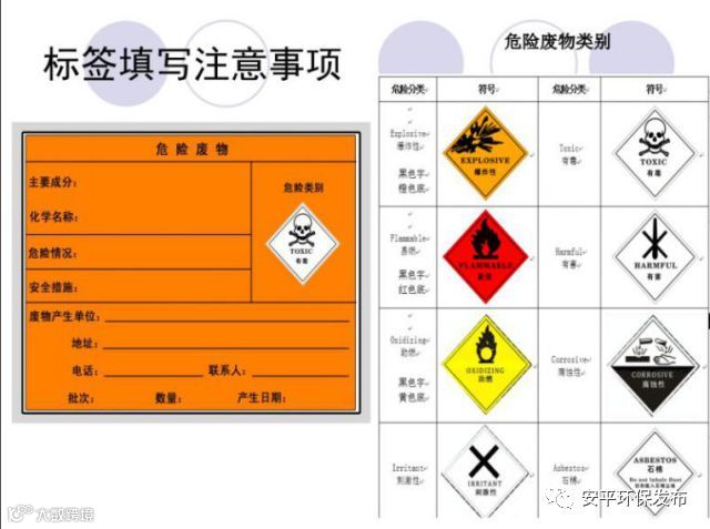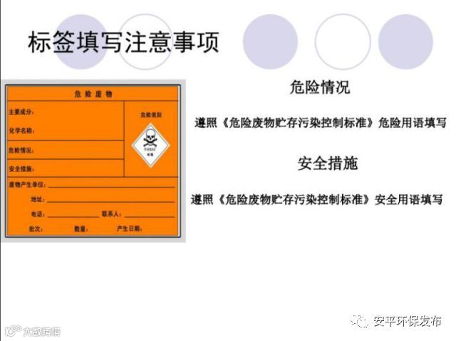 4.不同种类危险废物应有明显的过道划分,墙上张贴危废名称,液态危废需将成装容器放至防泄漏托盘内并在容器粘贴危险废物标签,固态危废包装需完好无破损并系挂危险废物标签,并安要求填写。