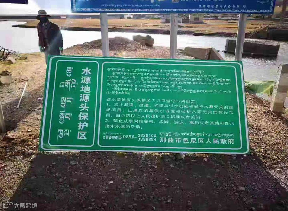 绿底白字、汉字藏文、举报电话、法律规定……这是西藏自治区那曲市色尼区政府制作的“水源地源头保护区”标志牌的文字。根据水污染防治法要求,饮用水水源地必须竖立标志牌。