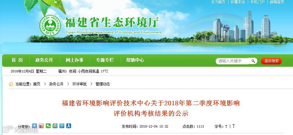 福建省环境影响评价技术中心关于2018年第二季度环境影响评价机构考核结果的公示