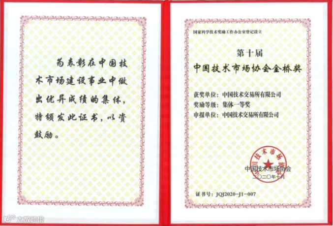 第十届中国技术市场协会金桥奖,中技所荣获集体一等奖