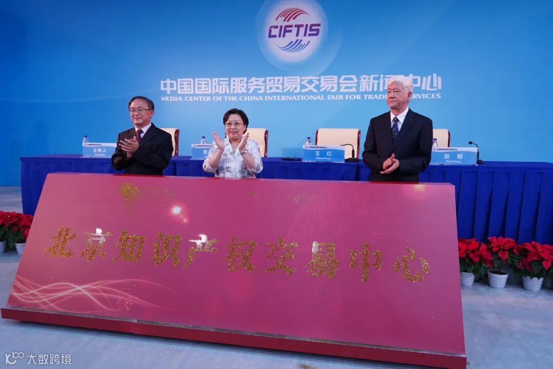 北京市副市长王红、国家知识产权局副局长赵刚、科技部火炬中心主任贾敬敦为北京知识产权交易中心揭牌