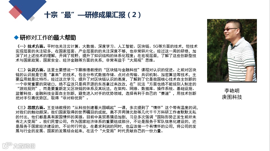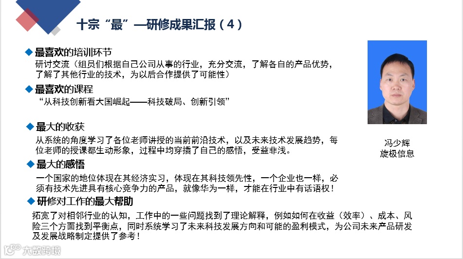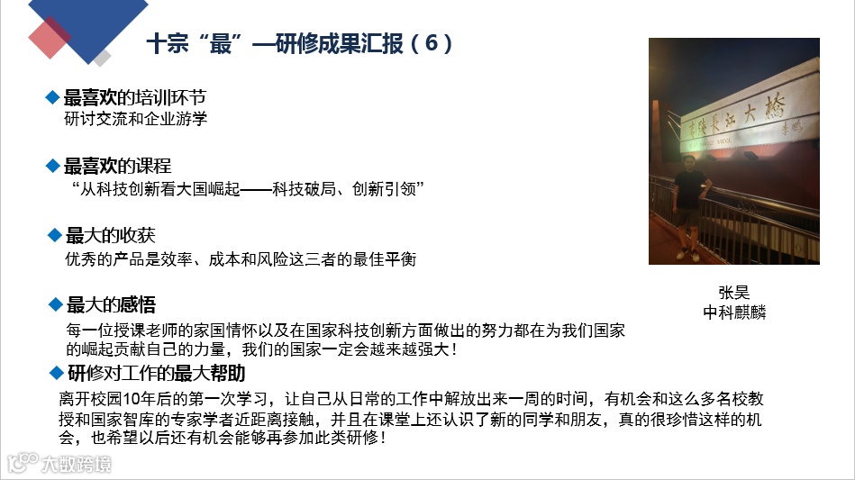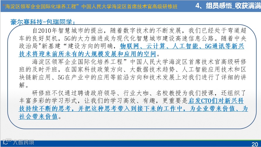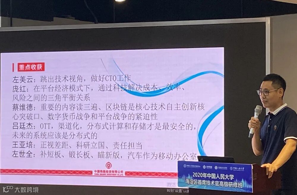 在最后的结业典礼环节,陈院长为各位学员颁发了2020年海淀区领军企业国际化培训工程—人大CTO班结业证书,并代表人大做了结业致辞,对学员未来的学习成长、企业的长远发展寄予了美好的祝愿和殷切的期望。至此,2020年海淀区领军企业国际化培训工程——中国人民大学海淀区首席技术官高级研修班圆满落幕。