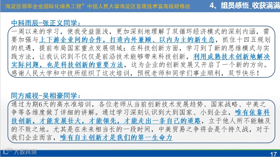 9月21至26日,由海淀区人力资源和社会保障局指导,海淀区人力资源公共服务中心主办,中国技术交易所、中国人民大学继续教育学院联合承办的“海淀区领军企业国际化培养工程”培训项目第一期中国人民大学海淀区首席技术官高级研修班圆满完成历时6天三夜的各项培训环节。