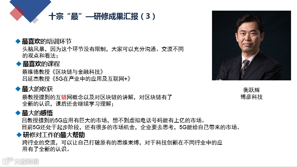 本期培训以海淀区高科技企业对国际前沿行业技术热点的实际需求为切入点,以“科技创新引领未来发展”为主题,重点设置人工智能、大数据、5G、区块链等专题模块,邀请中国人民大学、中科院、工信部赛迪研究院及加州伯克利大学教授专家——左美云、穆荣平、庞红、蔡维德、窦志成、秦波、Allen Yang、吕廷杰、王亚培、左世全进行授课。