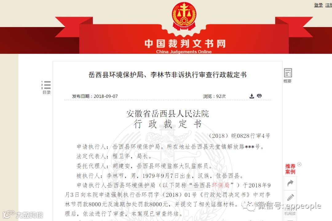 准予强制执行岳西县环境保护局于2018年1月16日作出的岳环罚字(2018)01号《行政处罚决定书》,对李林节罚款人民币8000元及逾期加处罚款8000元。