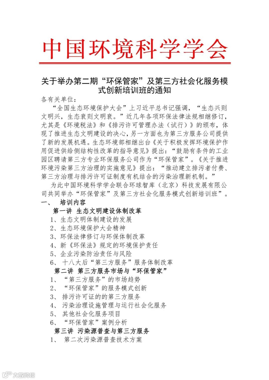 为此中国环境科学学会联合环球智库(北京)科技发展有限公司共同举办“环保管家”及第三方社会化服务模式创新培训班”。