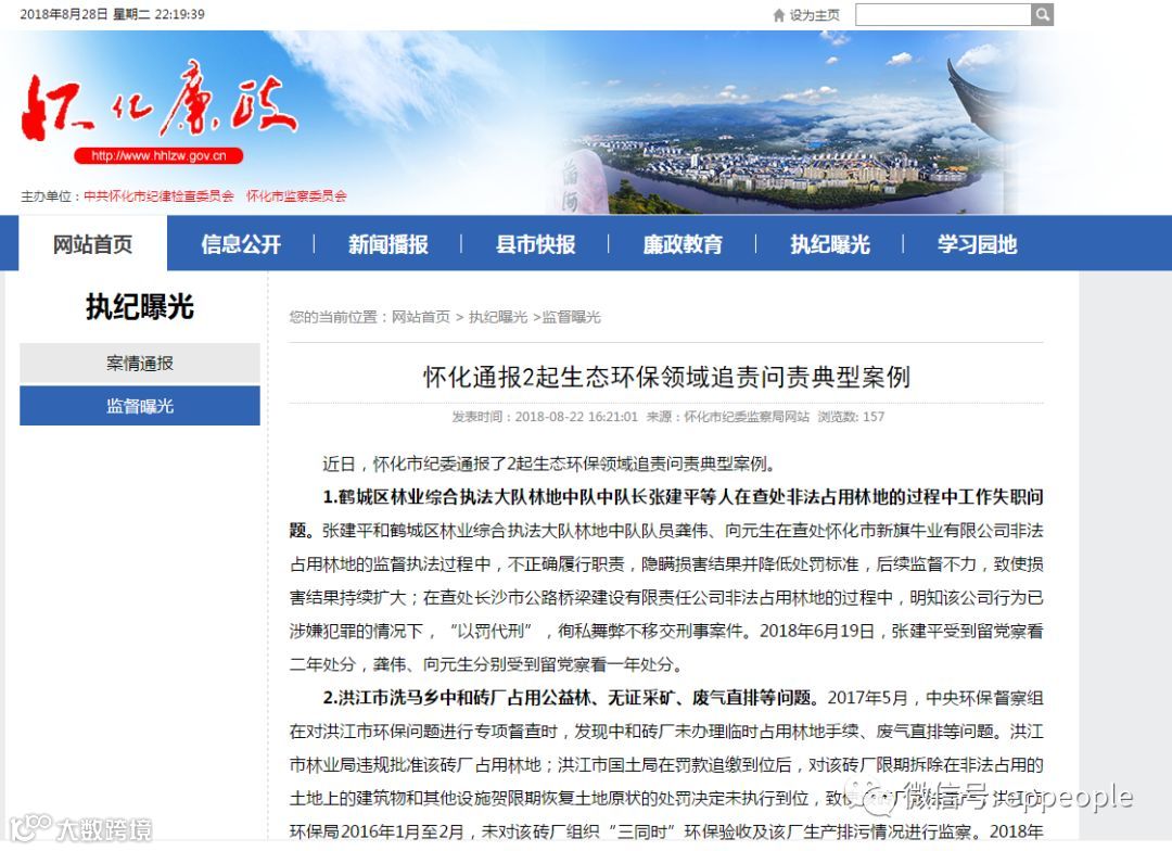 1.鹤城区林业综合执法大队林地中队中队长张建平等人在查处非法占用林地的过程中工作失职问题。张建平和鹤城区林业综合执法大队林地中队队员龚伟、向元生在查处怀化市新旗牛业有限公司非法占用林地的监督执法过程中,不正确履行职责,隐瞒损害结果并降低处罚标准,后续监督不力,致使损害结果持续扩大;在查处长沙市公路桥梁建设有限责任公司非法占用林地的过程中,明知该公司行为已涉嫌犯罪的情况下,“以罚代刑”,徇私舞弊不移交刑事案件。2018年6月19日,张建平受到留党察看二年处分,龚伟、向元生分别受到留党察看一年处分。