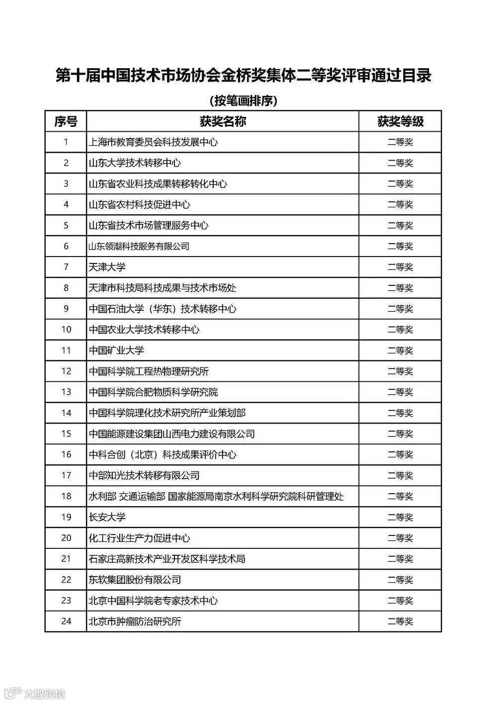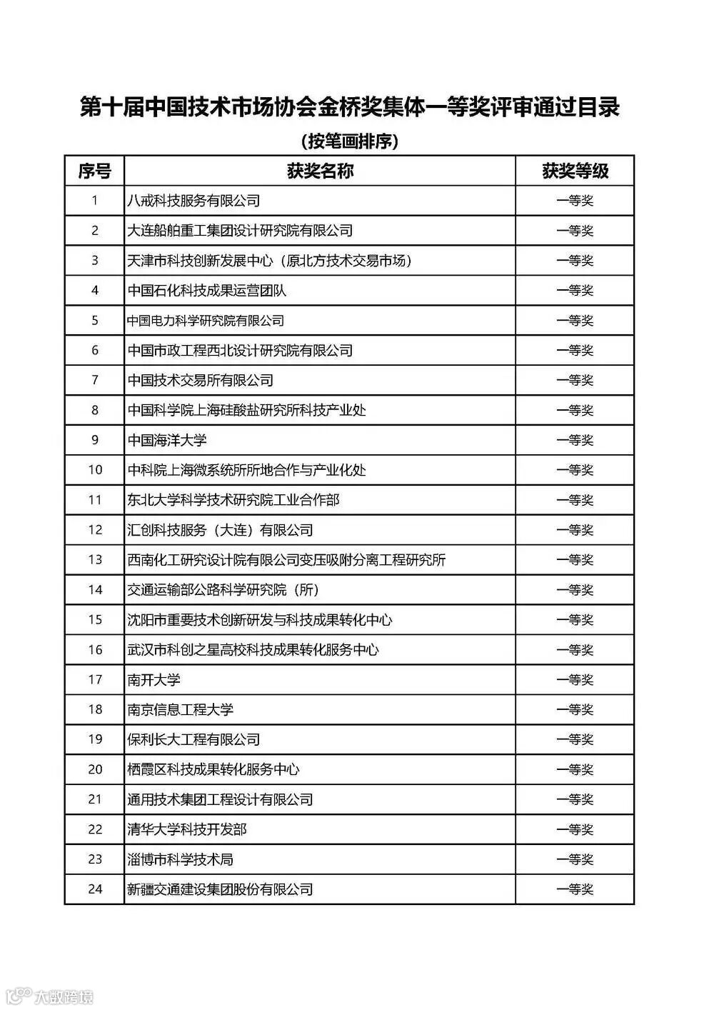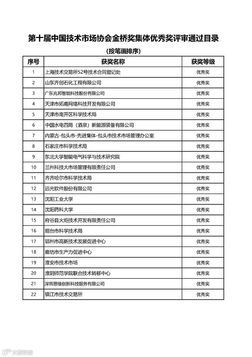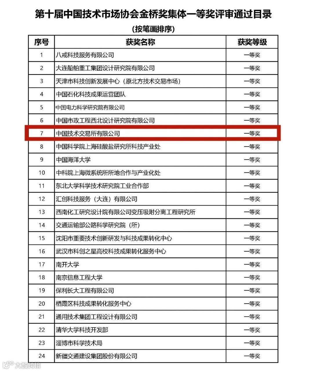 根据第十届中国技术市场协会金桥奖评审结果的公告,中国技术交易所荣获集体奖一等奖。