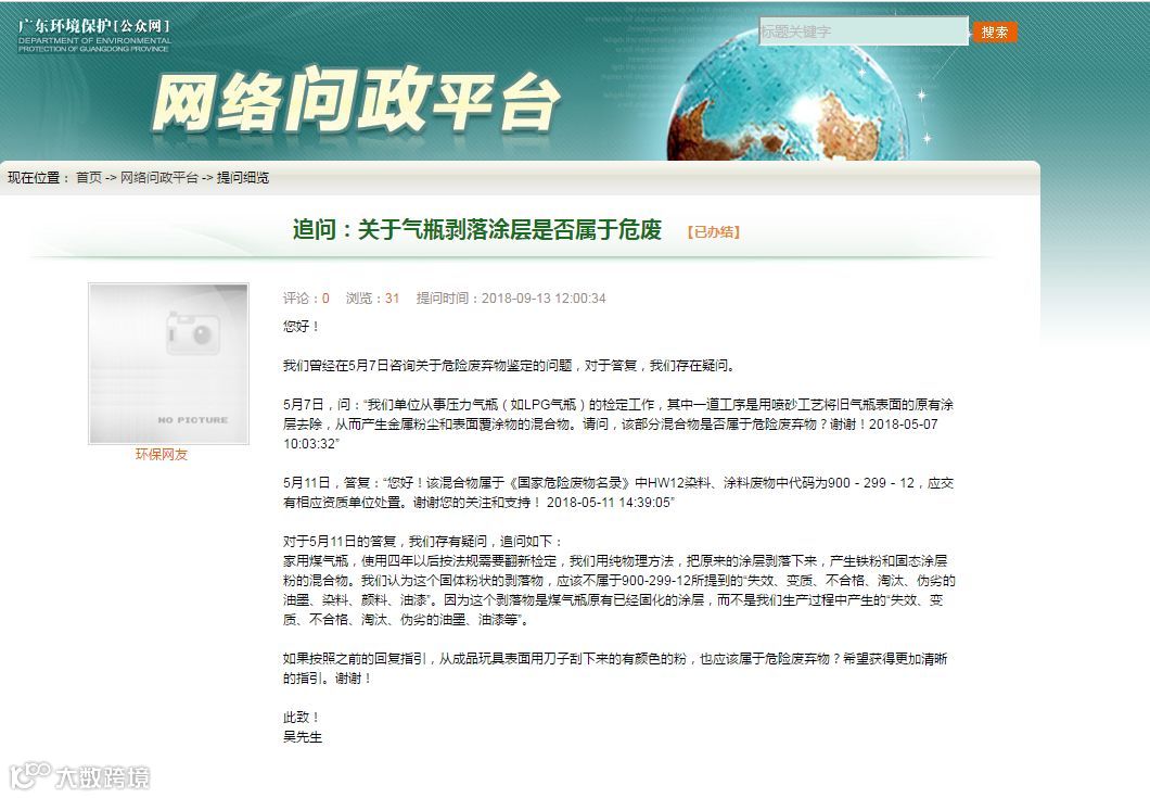 5月7日,问:“我们单位从事压力气瓶(如LPG气瓶)的检定工作,其中一道工序是用喷砂工艺将旧气瓶表面的原有涂层去除,从而产生金属粉尘和表面覆涂物的混合物。请问,该部分混合物是否属于危险废弃物?谢谢!2018-05-07 10:03:32”