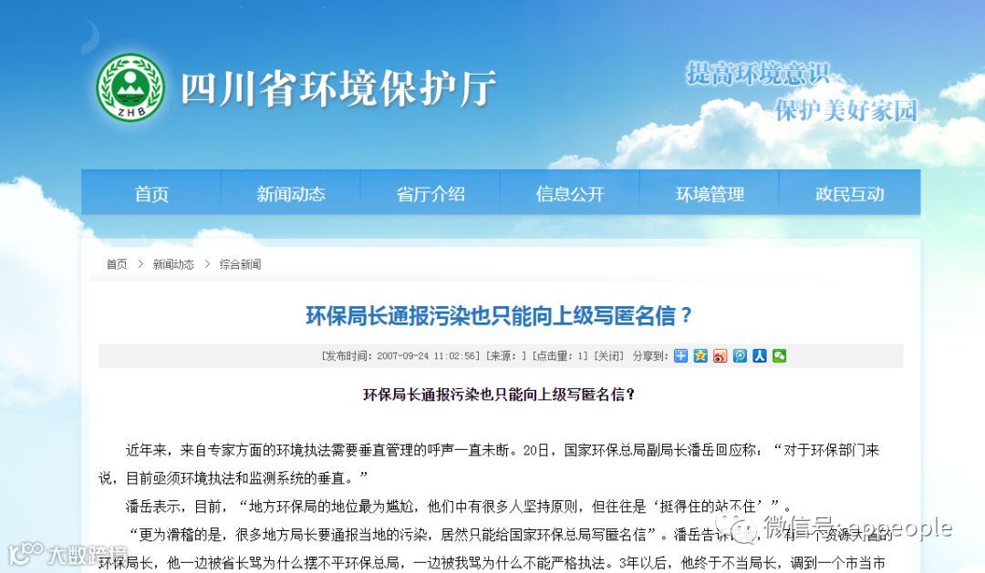 “更为滑稽的是,很多地方局长要通报当地的污染,居然只能给国家环保总局写匿名信”。潘岳告诉记者,“有一个资源大省的环保局长,他一边被省长骂为什么摆不平环保总局,一边被我骂为什么不能严格执法。3年以后,他终于不当局长,调到一个市当市长,他到北京来看我,喝醉了,3年憋的气终于迸发出来,指着我的鼻子骂了半个小时。”潘岳说,一个例子,道出了地方环保局所面临的尴尬和难处。