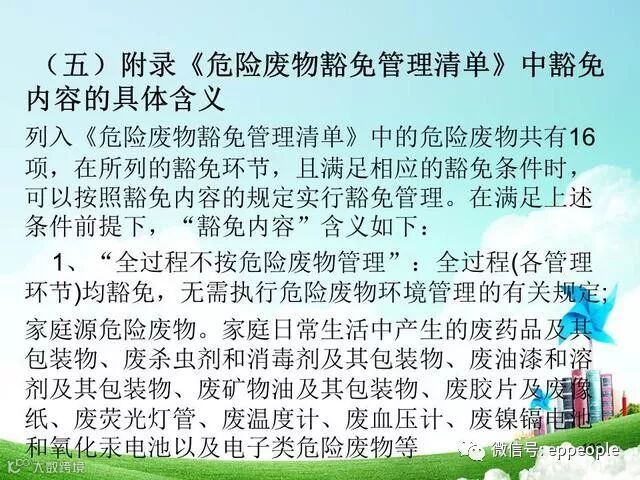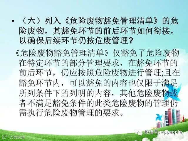 答:列入《危险废物豁免管理清单》中的危险废物,在所列的豁免环节,且满足相应的豁免条件时,可以按照豁免内容的规定实行豁免管理。在满足上述条件前提下,“豁免内容”含义如下: