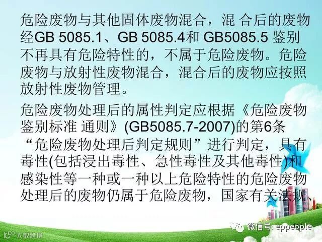 危险废物与其他固体废物混合后的属性判定应根据《危险废物鉴别标准 通则》(GB5085.7-2007)的第5条“危险废物混合后判定规则”进行判定,具有毒性(包括浸出毒性、急性毒性及其他毒性)和感染性等一种或一种以上危险特性的危险废物与其他固体废物混合,混合后的废物属于危险废物。仅具有腐蚀性、易燃性或反应性的危险废物与其他固体废物混合,混合后的废物经GB 5085.1、GB 5085.4和 GB 5085.5 鉴别不再具有危险特性的,不属于危险废物。危险废物与放射性废物混合,混合后的废物应按照放射性废物管理。